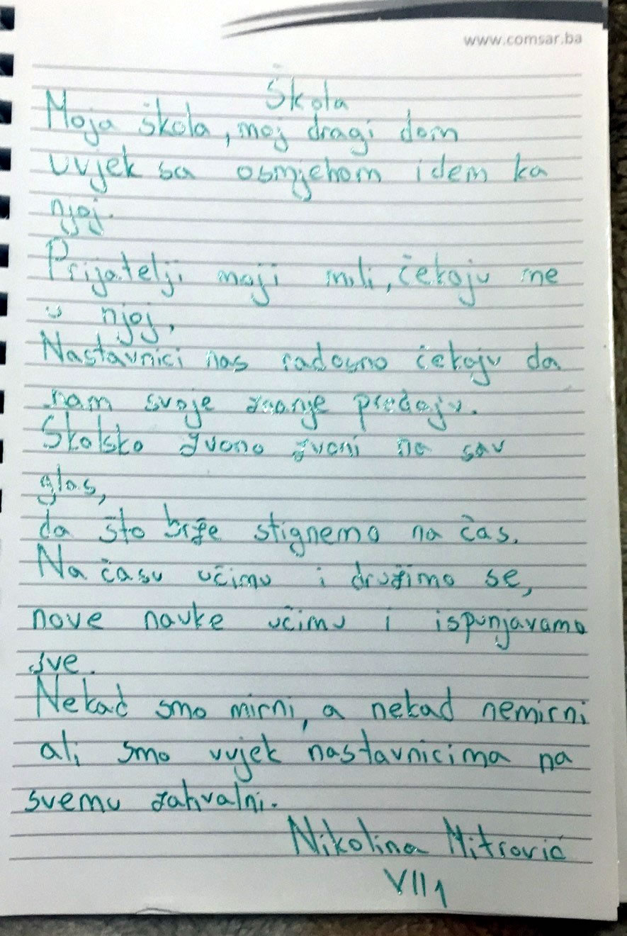 Ану Беара 5-1, Андреја Шамару 3-2, Марију Бургић 5-1, Ведрана Шамару 7-1, Василија Вука Шамару 5-1, Николину Митровић 7-1, Теодору Јокановић 1-2, Алексу Бабића 4-1, Анђелину Дакић 3-5, Ању Дукић 4-1, Нађу Ковачевић 2-1, Сандру Гајић 6-2, Ању Поповић 6-3, Екатарину Петрашевић 5-2, Соњу Крнета 5-1, Емилију Илић 8-4, Махаила Грујића 6-5, Александру Петрашевић 6-5, Уну Петковић 9-2, Сару Ерак 3-2, Сару Савић 5-4, Сњежану Кокеза 9-1, Теу Косић 5-1, Јеленка Станића 5-4, Софију Милошевић 5-1, Стефана Драгојевића 3-2, Алексу Шљивића 6-4, Јовану Кукић 7-1, Ивану Аврам 8-3, Кристину Кесић 6-5, Ксенију Поповић 7-2, Марију Алексић 9-5, Михајла Милаковића 3-2, Милоша Иванковића 6-5, Страхињу Бабића 7-3, Андрију Шљивића 4-1, Валентину Дакић 3-5, Ђорђу Милаковићу 7-3, Ању Срдић 7-4, Јелену Дошен 3-2, Ивану Пекез 4-3, Аријану Косић 5-4 и Ану Зеленика 5-1, Марка Илића 5-1, Игора Тодића 7-3, Георгину Боројевић 7-4, Ању Кесић 8-2, Нађа Сарић 6-5, Јелену Подрашчанин 8-2, Јану Ковачевић 4-2 и Василију Продановић 9-1 који су своје радове доставили на адресу школе.
